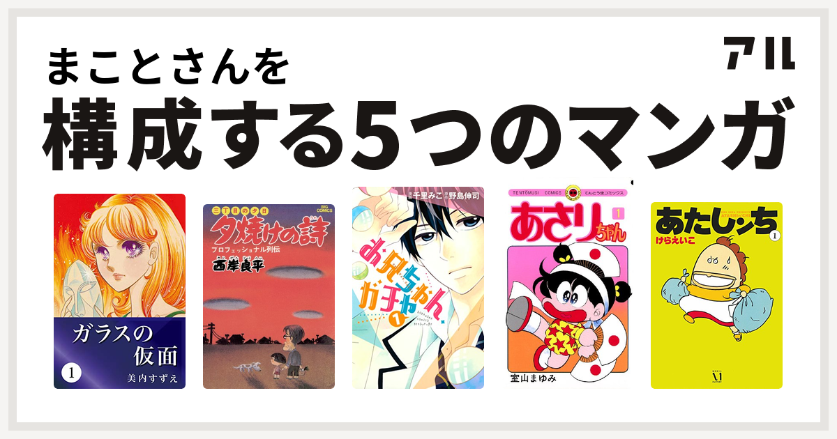まことさんを構成するマンガはガラスの仮面 三丁目の夕日 夕焼けの詩 お兄ちゃん ガチャ あさりちゃん あたしンち 私を構成する5つのマンガ アル